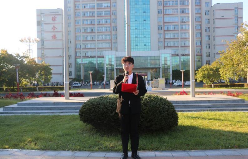 升旗仪式第二项,由我院第十届团总支副书记朴浩男同学作主题发言。“增强国防观念,建设强大国防”,这不仅仅是一句口号,它是时代的呼唤,是每一个中国人的责任与使命。
