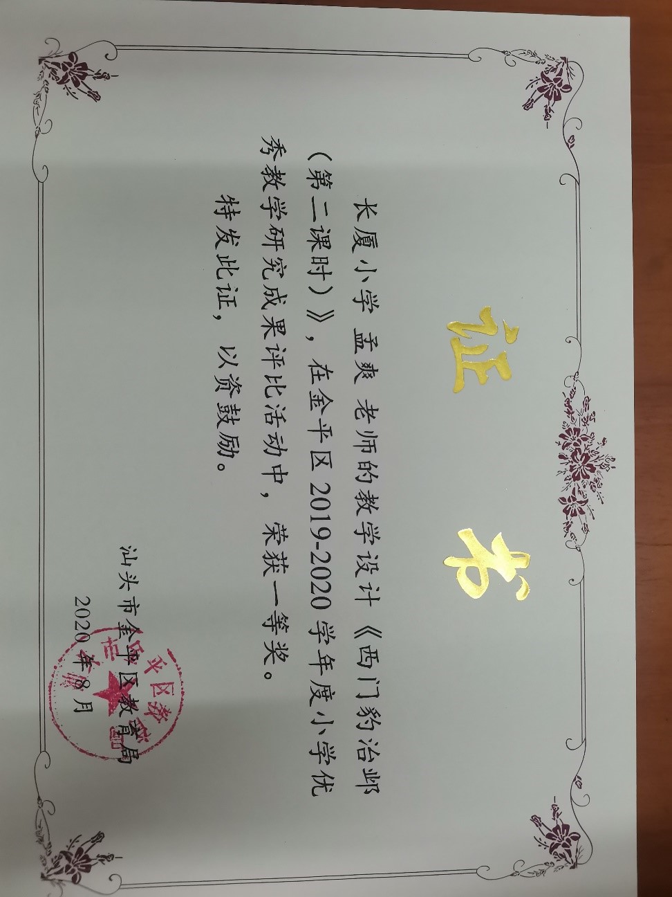 ①语文教学设计《西门豹治邺》获区教育教学成果评比一等奖;