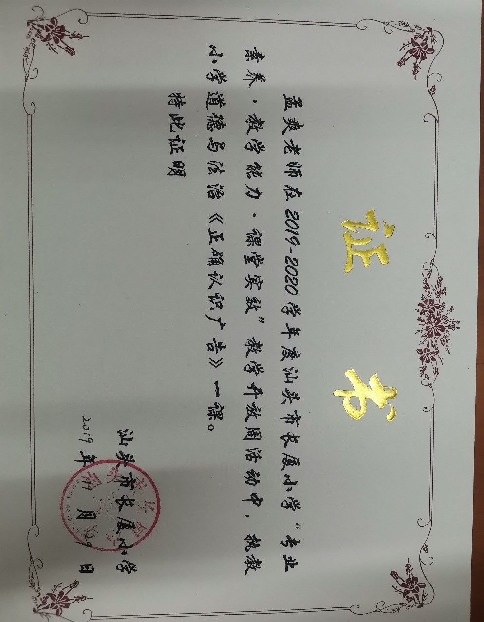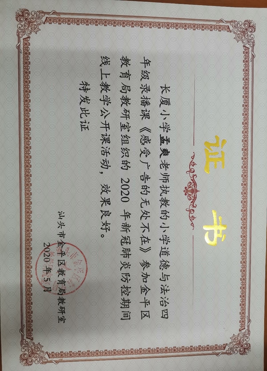 ①市级:2019.11.19汕头市小学道德与法治统编教材课堂教学研讨活动中执教《正确认识广告》(汕头市教育局教研室);