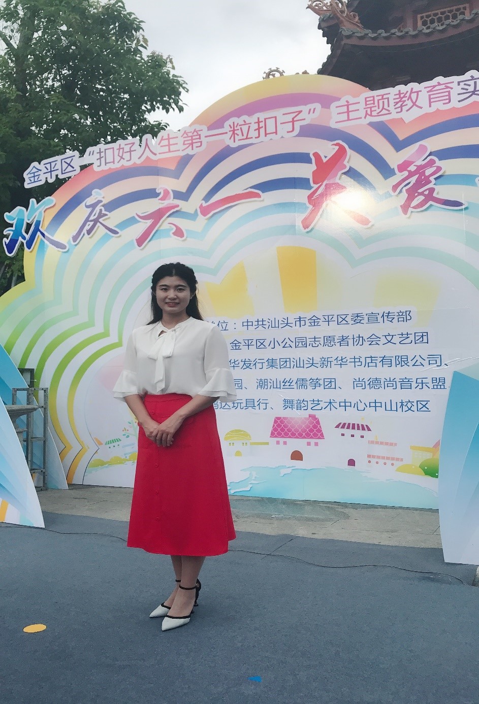 在校期间的教学实践给了我很大帮助,自从入职以来,我也积极主动参加社会实践活动,曾在礼赞劳动者 奋进新金平活动、美丽中国 我是行动者活动、欢度六一 关爱儿童文艺汇演等活动中多次担任主持工作。自2020年5月到2021年4月期间,在市委组织部主办的“汕头市道德模范等先进模范故事会巡演”中主演情景剧《致敬平凡,守护伟大》,已在金平区、龙湖区、澄海区、濠江区、潮南区五个区表演,均获得一致好评。