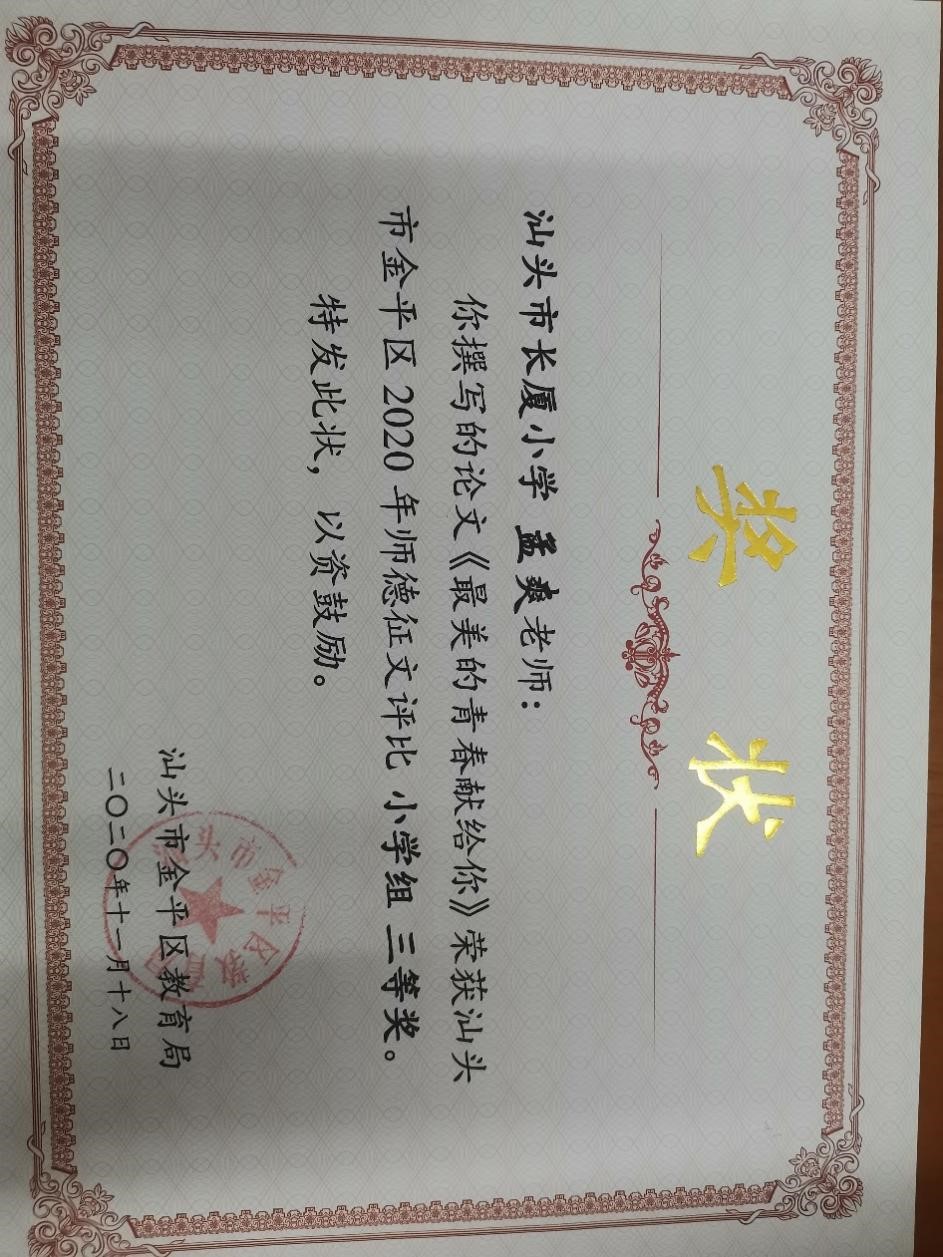 ③《最美的青春献给你》荣获汕头市金平区2020年师德征文评比小学组三等奖;