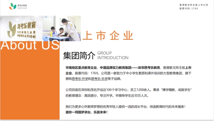 中国品牌实力教育集团——思考乐教育,香港联交所主板上市企业。公司是一家致力于中小学课外教育的大型培训企业,旗下拥有子品牌思考乐·升学与思考乐·乐学。公司目前在深圳、广州、茂名、苏州、等开设多教学点。秉承“博学精教,成就学生”的教育理念:高效提分,专注升学;思考乐专家顾问团队和资深教师经过教学实践与潜心研发,独创 5T+PTS 双核教学体系,用体系改变孩子未来,以科技驱动企业效能。创新“366”教学法、“知识+育人”双核培养系统;以激发孩子学习兴趣、树立健全人格为己任,年辅导学生近 30 万人次。公司荣获“最具影响力教育品牌”、“2019 年度品牌影响力教育集团”、“2018年度品牌实力教育机构”、“最具诚信教育品牌”、“2018 中国管理改革创新先进单位”等行业及企业殊荣。