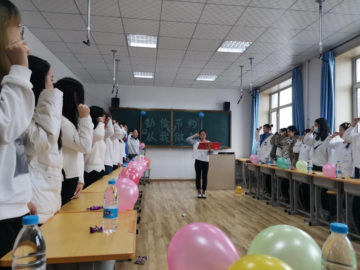 活动第六项,由主持人李田田领誓,全体同学举起右拳宣誓,用语言的力量表达了勤俭节约的决心。