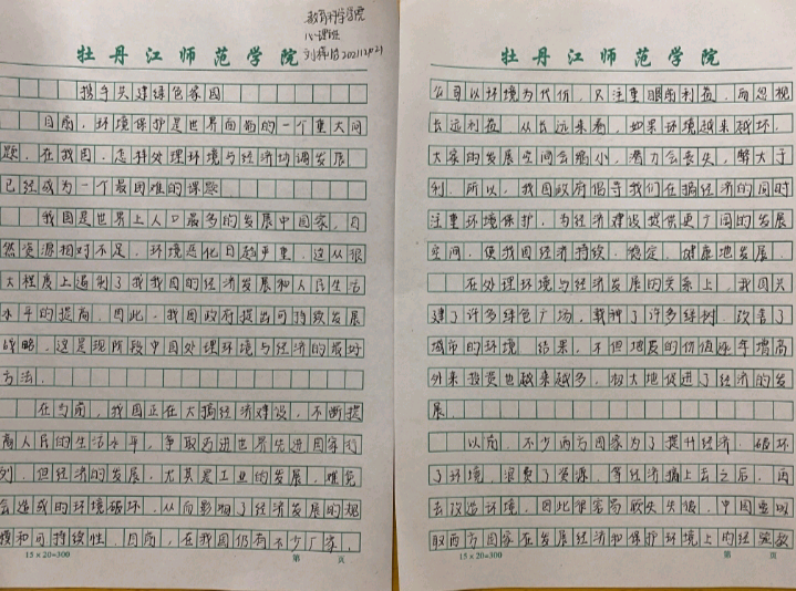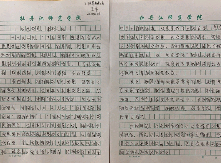 2021级学前教育班的贾欣瑶同学和王卓同学条理清晰,言之有序,字迹工整,内容充实,作品如下: