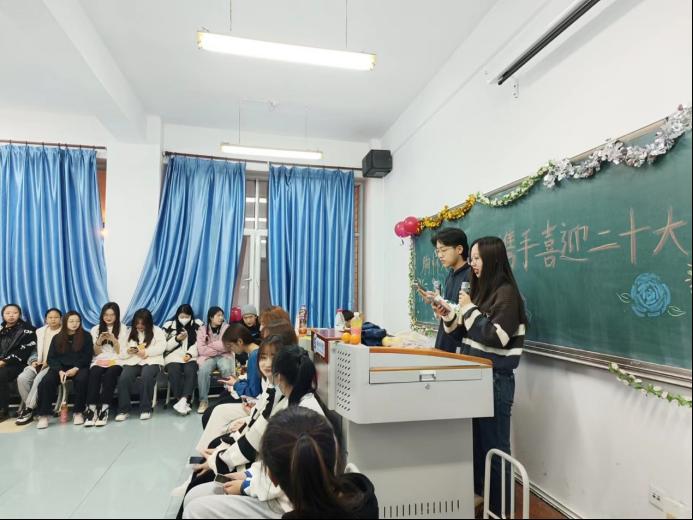 本次团日活动由李金禧、许赫家两位同学担任主持人。活动伊始两位主持人为大家生动介绍了党的二十大对于我国大政方针乃至于未来发展趋势的重要作用。使同学们深刻认识到党的二十大事关党和国家事业继往开来,事关中国特色社会主义前途命运,事关中华民族伟大复兴,使同学们对于党的二十大有了更进一步的了解。