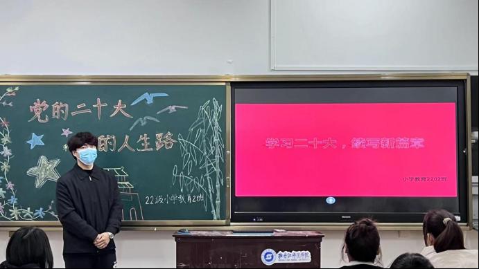 党的二十大是我们党进入全面建设社会主义现代化国家、向第二个百年奋斗目标进军新征程的重要时刻召开的一次十分重要的代表大会,是党和国家政治生活中的一件大事。为深入贯彻党的二十大会议精神,引导学生深入学习和全面深入领会党的二十大精神,在“学”字上下功夫,在“宣”字上有创新,在“行”字上见实效。教育科学学院2022级小学教育二班于11月16日19:00在外语楼608开展“党的二十大和我的人生路”青春使命教育主题班会,本次班会由班长窦琳程主持。