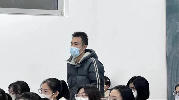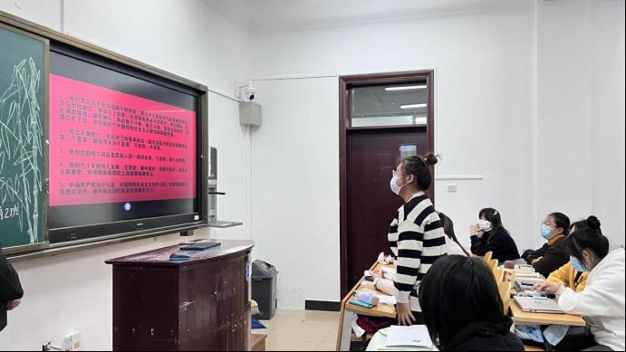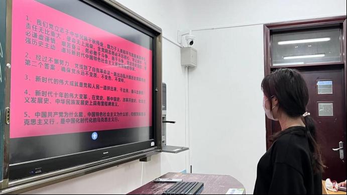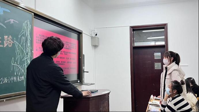 班会第三项,班长窦琳程介绍七一勋章获得者“时代楷模”张桂梅校长的生平经历和办学事迹,并且分享自己作为师范生对未来人生路的看法。通过学习,同学们了解了这位来自牡丹江市的最美教师,学习张校长的办学精神,树立行业楷模。